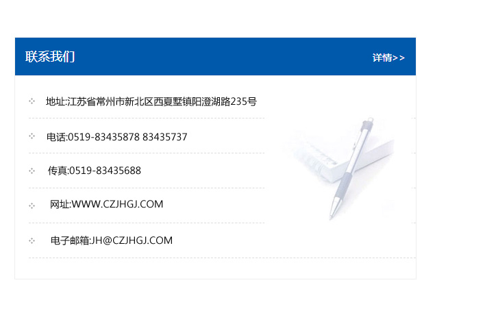 地址:常州市新北區友邦商務大廈1幢16、17層  電話:0519-85101652  傳真:0519-85112595  郵編:213022  網址:www_cz-jiayue_cn.528bt.com  郵箱:xiajifengaa@163.com
